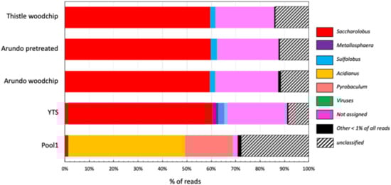 Interestingly, in all samples, among the known genus, the most abundant is Saccharolobus (~60%) followed by Sulfolobus ranging from 2.5% in the sample containing Arundo pretreated to 2.0% in Thistle. More specifically, the reads assigned to the genus Saccharolobus are related to the species S. solfataricus (57%), S. shibatae (0.6%), and S. caldissimus (0.1%). Differently, the genus Metallosphaera is present only in the YTS sample (2.4%) and, possibly it has been negatively selected by the other biomasses.