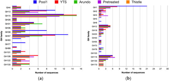 Among GHs, 23 families were identified in all samples, 14 of which were active on substrates with axial C1-OR bond (Figure 2a) and 11 on substrates showing equatorial C1-OR bond (Figure 2b) for a total of >300 sequences encoding for putative GHs. In general, selection produced a clear change in CAZymes composition in the four enrichments if compared to Pool1, as both number and type of families, and numerosity of enzymes. In particular, among the enzymes active on substrates with equatorial O-glycosidic bonds (C1-OR), different sequences belonging to families of exo- and endo-glycosidases active on hemicellulosic oligosaccharides such as xylan, xyloglucan, and mannan (GH1, GH3, GH12, and GH116) have been identified. Among the families grouping enzymes active on axial C1-OR bonds, 6 group exo- and endo-glycosidases were active on starch and maltodextrines (GH13, GH15, GH31, GH57, GH122, and GH133). It is worth noting that most of the GHs families active on substrates containing equatorial C1-OR bonds that have been found in the microbiomes growing on the four carbon sources tested were present in the original sample from Pool1. The number of sequences present in the GHs families active on equatorial C1-OR bonds from the enrichments was about the same as those found in Pool1. However, a clear selection was observed. Sequences from GH5, GH8, GH73, and GH103, which were present in Pool1, were absent in the enrichments and the number of sequences assigned as GH1 originally present in Pool1 was dramatically reduced upon enrichment. On the other hand, the sequences annotated in GH170 that could be identified in the microbiomes from all four enrichments were lacking in Pool1 and family GH3 showed 4 CAZyme sequences in Arundo pretreated vs. 1 in Pool1.