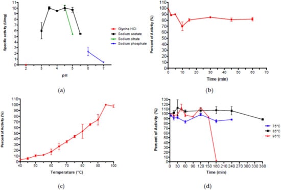 The deduced protein sequence of Aglu1 was multi-aligned toward the archaeal characterized enzymes belonging to GH31, showing the presence of the conserved catalytic residues of this family, and suggesting that the gene encodes for a functional enzyme. Indeed, the recombinant pure Aglu1 was optimally active on 4Np-α-Glc in a sodium acetate buffer in the range of pH 3.5–5.0 (Figure 4a) at 95 °C (Figure 4c) showing remarkable stability at 75 °C, 85 °C and 95 °C (Figure 4d).