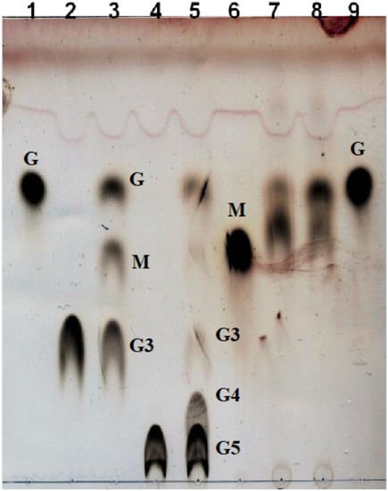 TLC analysis of the enzymatic assays on maltotriose, maltopentaose and nigerose. Lanes 1 and 9: Glucose. Lane 2: blank on maltotriose. Lane 3: Aglu1 on maltotriose. Lane 4: blank on maltopentaose. Lane 5: Aglu1 on maltopentaose. Lane 6: Maltose. Lane 7: blank on nigerose. Lane 8: Aglu1 on nigerose. G: glucose; M: maltose; G3: maltotriose; G4: maltotetraose; G5: maltopentaose.