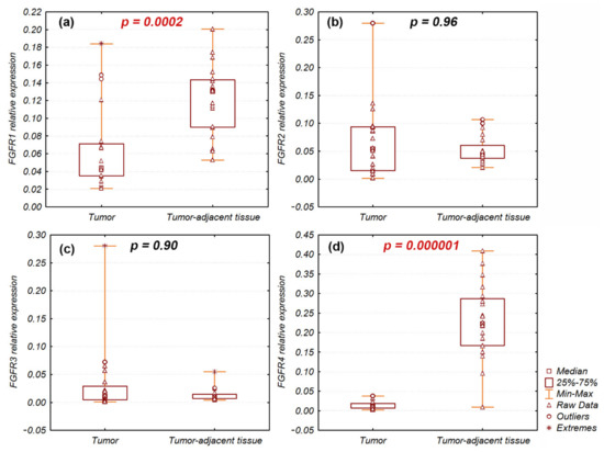 FGFR1 and FGFR4 gene expression levels were significantly decreased in tumor samples (n = 20) compared with tumor-adjacent normal tissue (n = 20): FGFR1 (p = 0.0002) and FGFR4 (p = 0.000001) (Figure 1). Nevertheless, FGFR1 and FGFR4 expression levels were increased and approximated to expression in tumor-adjacent normal tissue (fold-change, ~1) in individual tumor samples: 3 (15%) and 1 (5%), respectively (Figure S1). FGFR2 and FGFR3 mRNA expression levels were not significantly different between tumor and tumor-adjacent normal tissues (p = 0.97 and p = 0.9, respectively). However, in individual tumor samples, FGFR2 and FGFR3 expression levels were enhanced: fold-changes > 2 were observed in 5 (12.5%) and 7 (17.5%) samples, respectively (Figure S1).