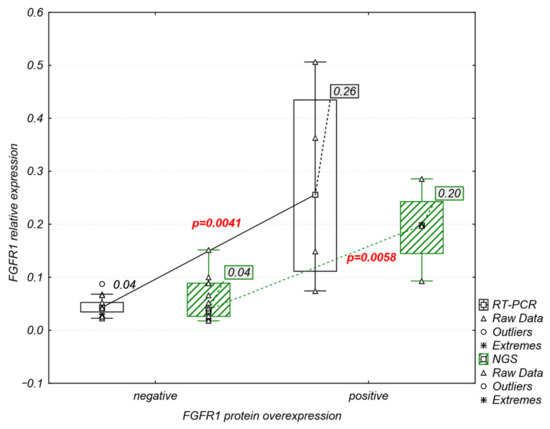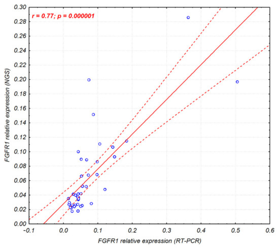 Additionally, the presented results show the usefulness of anchored multiplex PCR followed by NGS for FGFR1–3 gene expression analysis. The high correlation (77–95%) of FGFR expression obtained with the use of RT-PCR and an NGS panel was observed, despite the different sets of reference genes. In RT-PCR, POLR2A and ACTB were used to normalize expression, while the NGS panel contained CHMP2A, GPI, RAB7A, and VCP. Thus far, use of the relative gene expression data obtained with the applied NGS panel for genetic profiling has been described for acute myeloid leukemia [40], while it was previously limited to determining gene fusion occurrence [41,42].