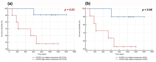 Analysis of FGFR1–4 expression and disease-free survival (DFS) revealed that the increased level of FGFR3 mRNA was correlated with an increased risk of recurrence (RT-PCR: hazard ratio (HR) 4.72, p = 0.029; NGS: HR 7.9, p = 0.0049). Kaplan–Meier survival curves also showed a trend toward poorer prognosis for patients with high FGFR3 expression compared to those with low expression (Figure 3). The mean DFS time of patients with high and low FGFR3 expression was 620 days (<2 years) and 1037 days (~3 years), respectively. FGFR1 (RT-PCR: p = 0.44, NGS: p = 0.56), FGFR2 (RT-PCR: p = 0.22, NGS: p = 0.19), and FGFR4 (p = 0.97) expression levels did not affect the risk of recurrence.