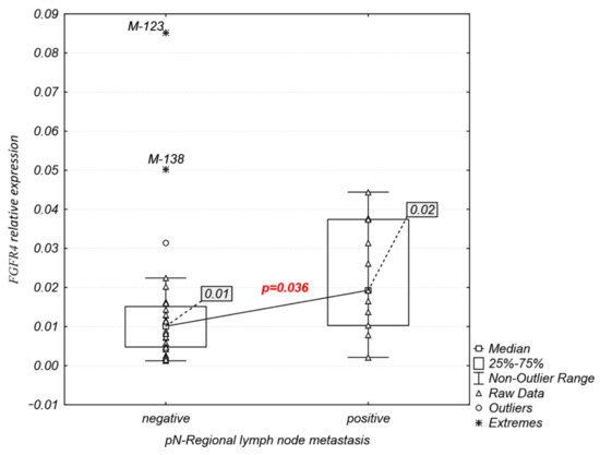 Interestingly, analysis of FGFR1–4 expression association with clinicopathological characteristics (Table 1) revealed that the FGFR4 mRNA expression was significantly higher in patients with lymph node metastasis (median: 0.02 vs. 0.01, p = 0.036; Figure 4), while FGFR1–3 expression levels were not significantly related to any of the clinicopathological features examined.