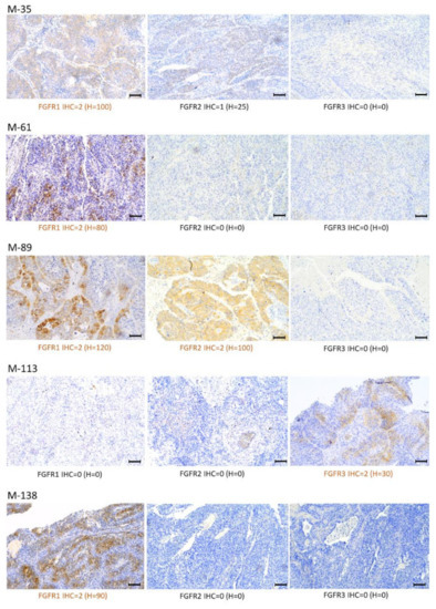 FGFR1, FGFR2, and FGFR3 protein expression levels were determined in 18 tumors (FFPE tissue samples). Immunohistochemistry (IHC) was performed according to the manufacturer’s instructions. Slides were stained with the Dako Omnis immunostainer and Dako EnVision Flex + reagents (Dako Omnis, Dako Agilent Technologies, Leuven, Belgium). Tissues were incubated with the following primary antibodies: anti-FGFR1 (clone D8E4, Cell Signaling Technology, Danvers, MA, USA), anti-FGFR2 (ab10647, Abcam, Cambridge, UK), and anti-FGFR3 (clone B-9; Santa Cruz Biotechnology, Santa Cruz, CA, USA) as previously described [70,71,72]. The IHC slides were counterstained with hematoxylin and coverslips were applied. Staining intensity was categorized based on a four-level scale: negative (0), weak (1), moderate (2), and strong (3). Overexpression was defined as follows: FGFR1—moderate (2) or strong (3) intensity membrane and/or cytoplasmic staining in ≥ 10% tumor cancer cells previously described by Theelen et al. [44]; FGFR2—moderate (2) or strong (3) complete membrane staining intensity in ≥ 10% tumor cancer cells evaluated according to the HercepTest scoring guideline [73]; FGFR3—at least weak but extensive positivity (2) or strong positivity (regardless of extent) (3), as previously described by Tomlinson et al. [74]. Continuous variables were used according to the following formula: H-score = 0 x (% cells with no staining [0]) + 1 x (% cells staining faint, weakly [1+]) + 2 x (% cells staining moderately [2+]) + 3 x (% cells staining strongly [3+]).