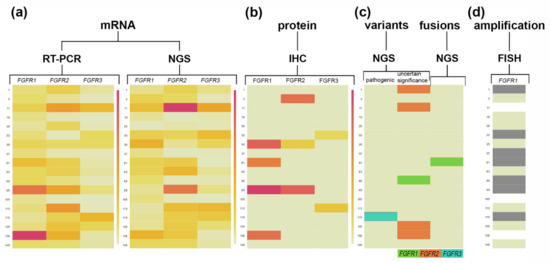 FGFR1, FGFR2, and FGFR3 transcript and protein levels together with FGFRs variants and FGFR1 amplification status. Heat maps illustrate the (a) FGFR1-3 relative gene expression values (mRNA) with differentiation for RT-PCR and NGS methods; (b) FGFR1-3 protein expression levels based on H-score; (c) FGFRs variants occurrence with differentiation for clinical significance and FGFRs fusions; (d) FGFR1 amplification status based on FGFR1/CEN8 ≥ 2.0 or the average number of FGFR1 signals per cell ≥ 6 or ≥10% of tumor cells containing ≥ 15 FGFR1 signals or large clusters; for Sq-NSCLC samples. The largest gene expression values (a,b) are displayed in red color, intermediate values in shades of orange and yellow, and the smallest values in light yellow. Dark colored cells in the map (c,d) represent the variants, fusion, or an FGFR1 amplification occurrence, while no FGFRs variants, fusion, or amplification occurrence is indicated in light yellow. Not analyzed cells are indicated in white.