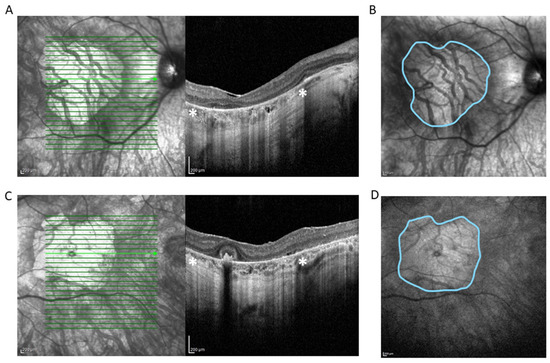 Spectral domain OCT scan (HRA+ OCT Spectralis®) depicting complete atrophy of the outer retina, loss of photoreceptors, disruption of retinal pigment epithelium, and underlying choriocapillaris in right eye (RE) (A) and left eye (LE) (C). * Zone of hypertransmission and sharp signal enhancement below Bruch’s membrane (white asterisks) corresponds to macular atrophy on en face near-infrared reflectance image of RE (B) and LE (D) (outlined in blue). The area of the macular atrophy zone measured with integrated Spectralis® software version 6.8 is 14.75 mm2 at RE and 14.45 mm2 at LE.