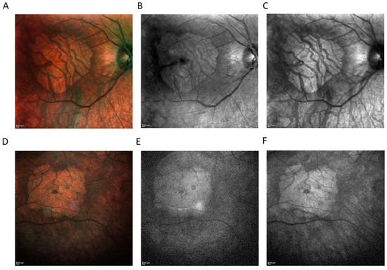 Imaging modality comparison (HRA+ OCT Spectralis®) showing area of macular atrophy. Color fundus photography of right eye (RE) (A) and left eye (LE) (D). Short-wavelength fundus autofluorescence (SW-AF) of RE (B), and LE (E). Near-infrared reflectance (NIR) of RE (C), and LE (F). SW-AF was absent, as well as NIR, indicating visual cycle gene mutations.