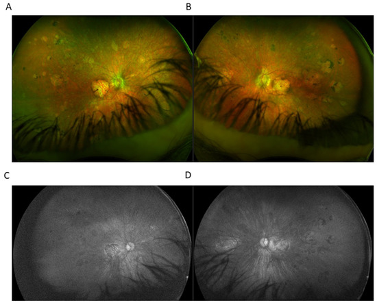 Optos® California (Optos Inc., Marlborough, MA, USA) ultra-widefield imaging depicted a grayish optic nerve head with clear boundaries. Chorioretinal atrophy was present on BE in the macular area, measuring 4.3 × 4.2 mm in RE and 4.4 × 4.0 mm in LE. In the mid and far periphery, seals of chorioretinal atrophy were evident, with marginal partial pigmentation ranging from 0.5 to 2-3 DD RE to 7-8 DD LE. Blood vessels were preserved up to the midperiphery, further markedly thinned (Figure 3).