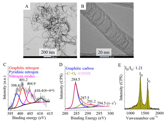 By using transmission electron microscopy, the fibrous structure of the prepared N-BCNTs was verified (Figure 1A). The graphene layers dividing the nanotubes into segments are also visible at higher resolution (Figure 1B).