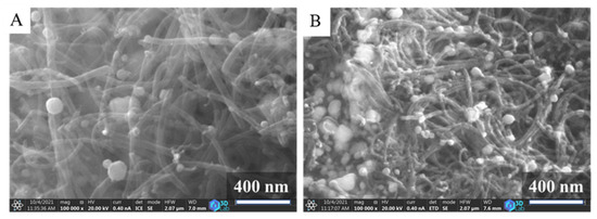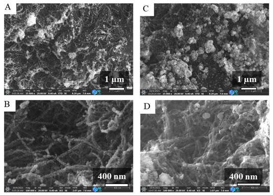 On the SEM images of the carbonized supports (Supplementary Materials Figure S1A,B), the fibrous structure of the N-BCNTs is visible and decorated with spherical objects, which are nickel nanoparticles that remained from the CCVD synthesis. More nanoparticles are visible on the SEM images of the Ni- and Fe-GCNC samples (Figure 2A,B) which contain not only the residual Ni from the CCVD synthesis, but also Ni and Fe particles that have replaced Na from Na-alginate.