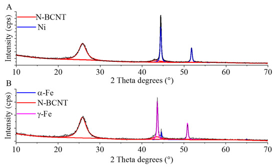 XRD pattern of the nickel (A) and magnetite (B) containing granulated carbon nanocomposites (GCNC).