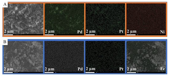 Elemental mapping was carried out on the Pd-Pt containing catalysts, to examine the metal distribution and coverage of the catalyst support. Elemental maps of the Pd-Pt/Ni-GCNC system indicates that the distribution of the nickel particles is homogenous and the bigger particle aggregates are mainly based on palladium, but where the Pd is enriched, Pt is also found in greater amount (Figure 5A). In the case of the Pd-Pt/Fe-GCNC catalyst, the large aggregates contain mostly iron, while the palladium and platinum nanoparticles are located in homogenous distribution on the surface (Figure 5B).