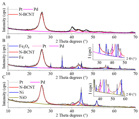 The presence of elemental Ni and Ni oxide in the nickel-containing system, Pd-Pt/Ni-GCNC, was verified (Figure 6C). The characteristic reflexions of Ni are found at 44.4° (111) and 51.7° (200) two theta degrees (PDF 04-0850). Peaks of the NiO phase are found at 37.2° (111) and 43.3° (200) two theta degrees (PDF 47-1049). Elemental palladium and platinum are also found in the sample.