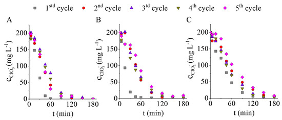 Decreasing chlorate concentration depending on the hydrogenation time by applying the developed catalysts over five cycles: Pd-Pt/Ni-GCNC (A), Pd-Pt/Fe-GCNC (B) and Pd-Pt/GCNC (C).
