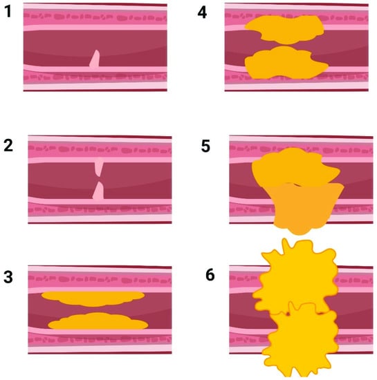 Schematic illustration representing the pathophysiology of urethra stricture. Stage 1 shows mucosal fold. In this stage, minor defects in the metaplastic tissue cause urinary extravasation that triggers the establishment of a fibrotic reaction. Increased deposition of ECM components results in the progression to further stages of US. Stage 2, shows Iris constriction. In stage 3, the fibrotic reaction has penetrated the spongiosum and caused a minimal fibrosis in the spongy tissue. Stage 4 shows full-thickness spongiofibrosis. In stage 5, fibrosis has penetrated the tissues outside the corpus spongiosum. In stage 6, a complex US has formed that is usually accompanied by a fistula.