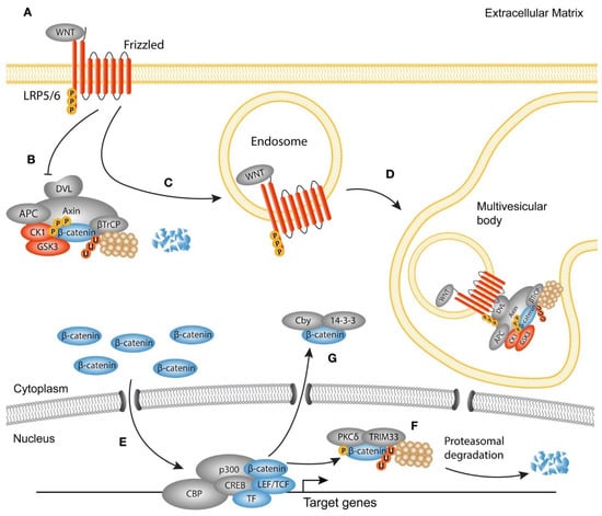 Schematic illustration representing the role of Wnt/β-catenin signaling pathway in fibrosis. (A) shows the binding of Wnt to the frizzled receptor that forms a complex with LRP. (B) shows the ubiquitination of the degeneration complex composed of DVL, Axin, APC, GSK3, and CK1. (C) shows the internalization of the receptor complex into the endosomal vesicles that causes the sequestration of the degeneration complex and suppression of GSK3. (D) GSK3 is then transferred to MVB and protects cytoplasmic β-catenin against proteasome degradation. In section (E), β-catenin is then carried to the nucleus and interacts with various transcription proteins such as LEF/TCF, p300, and CBP. (F) shows the termination of the signaling pathway. PKC-6 phosphorylates the β-catenin, making it a target for ubiquitination with (TRIM)33. Then, the ubiquitinated β-catenin is degraded in the proteasome complex. (G) Wnt/β-catenin signaling pathway may also end with 14-3-3ζ and Chibby (Cby). Abbreviations: Lipoprotein-related-receptor protein (LRP), dishevelled (DVL), adenomatous polyposis coli (APC), glycogen synthase kinase 3 (GSK3), and casein kinase 1(CK1), T cell factor/lymphoid enhancer factor family (LEF/TCF), protein kinase C (PKC)δ, tripartite motif (TRIM)33, CREB-binding protein (CBP). Adopted from reference [].