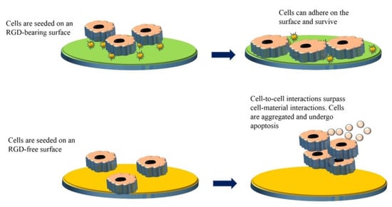The delivery system for adherence-dependent cells should provide cell recognition sites for cell adhesion and survival; otherwise, the cell-to-cell interactions will surpass cell–material interactions that cause the cells aggregation within the delivery system and their apoptosis (Figure 3) []. Integrins are principle cell surface receptors that mediate cell binding to ECM components such as collagen, fibronectin, and vitronectin. These polymers possess RGD moieties in their structure, and integrins bind to these peptides. Therefore, delivery systems for these cells should contain RGD-bearing polymers or be functionalized with RGD moieties [].