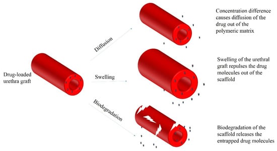 Schematic illustration representing the mechanisms involved in drug release from polymeric urethra grafts.