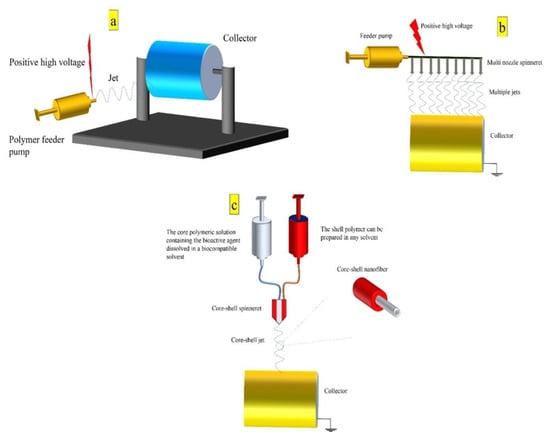 The conventional electrospinning method has a low production yield and cannot be utilized for the mass production of fibrous scaffolds. This drawback can be addressed by increasing the number of spinnerets (Figure 5b) []. Furthermore, many solvent systems are incompatible with bioactive agents and damage their structure and function. Notably, growth factors are susceptible to organic solvents and lose their biological activity upon contact with these chemicals []. Core-shell electrospinning method can address this issue. In this method, the bioactive agent is dissolved in a compatible solvent (usually aqueous solvents) and spun in the core. At the same time, the shell part of the fibers can be a polymeric solution with any solvent system (Figure 5c) [].