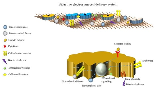 The natural niche of cells is composed of tissue-specific microenvironmental factors that control cells’ behavior and preserve their biological functions. In this context, a diverse range of biochemical and biophysical cues such as growth factors, cytokines, the architecture of ECM, the composition of ECM, mechanical properties, bioelectrical cues, surface topography, cell-to-cell contacts, and intercellular communications by extracellular vesicles (EVs) have been found to affect cellular behavior and function [,,]. Therefore, an ideal electrospun cell delivery vehicle should mimic this complex network (Figure 6).