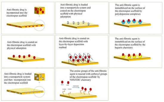 The complexity of US pathophysiology requires a versatile approach to develop effective treatment strategies. Even though electrospun scaffolds recapitulate some features of the native urethra tissue, their bioactivity is not sufficient to prevent US recurrence [,]. Therefore, anti-fibrotic bioactive agents should be incorporated into their matrix or immobilized onto their surface. In this regard, various methods such as blending with the polymeric solution, physical adsorption, use of nanoparticles, layer-by-layer surface coating, and surface immobilization technologies have been proposed to functionalize the electrospun scaffolds (Figure 7) [,].