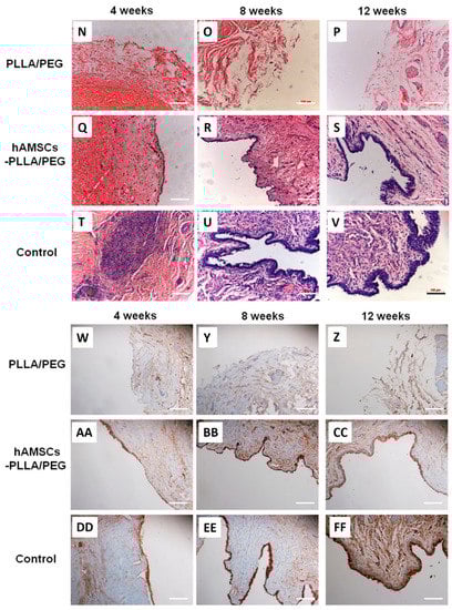 - Lu, X.; Guo, Q.; Han, F.; Chen, C.; Ling, C.; Chen, W.; Li, B. Electrospun Poly (L-Lactide)/Poly (Ethylene Glycol) Scaffolds Seeded with Human Amniotic Mesenchymal Stem Cells for Urethral Epithelium Repair. Int. J. Mol. Sci. 2016, 17, 1262. [Google Scholar] [CrossRef]