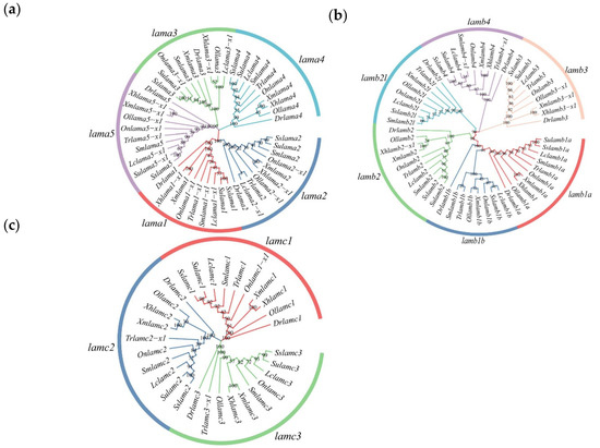 Phylogenetic analysis of laminin nucleotide sequence of ten species. Dr (Danio rerio), Lc (Larimichthys crocea), Sm (Scophthalmus maximus), Ol (Oryzias latipes), Tr (Takifugu rubripes), On (Oreochromis niloticus), Xm (Xiphophorus maculatus), Xh (Xiphophorus helleri), Ss (S. schlegelii) and Su (S. umbrosus). The numbers on the graph represent approval ratings. (a) Phylogenetic tree of laminin α chains; (b) Phylogenetic tree of laminin β chains; (c) Phylogenetic tree of laminin γ chains. The same gene from different species comes together to form a single branch with the same color.