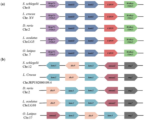The position of tandem laminin genes in teleosts. The arrow direction indicates the direction of transcription. Dashed lines indicate discontinuities between genes. Genes of the same gene or family are represented in the same color. (a) Orders of lamb2 and lamb2l in teleosts; (b) Orders of lamc1 and lamc2 in teleosts.