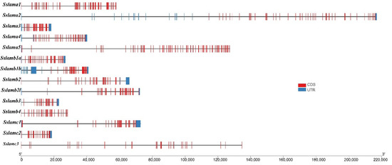 Gene structures of 14 laminin genes. The black solid line represents the intron region. The blue rectangle represents the UTR region, and the red rectangle represents the exon region.