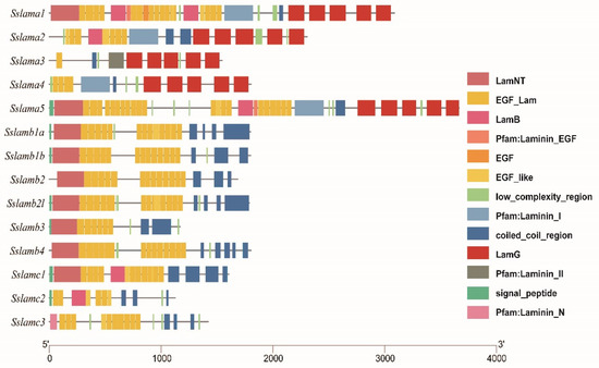 Conserved domains analysis of laminin genes. The number represents the length of the amino acid. Different colors of rectangle represent diverse domains.
