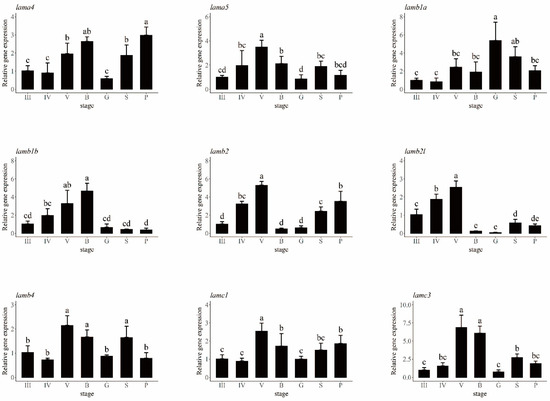 Expression analysis of laminin genes at seven different ovarian development stages. The relative expression levels of laminin genes are shown in different colors. III: ovary at stage III; IV: ovary at stage IV; V: ovary at stage V; B: blastula stage; G: gastrula stage; S: somites stage; P: prehatching stage. Different letters are signs of significant differences.