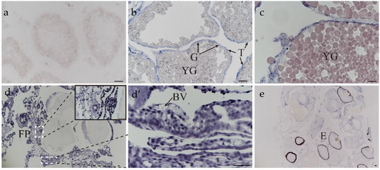 The location of lama4 in ovaries during oogenesis and gestation. (a) ovary at stage III; (b) ovary at stage IV—YG: yolk globule; T: theca cell; G: granulosa cell; (c) ovary at stage V; (d) embryos at the blastula stage—B: blastula stage, FP: follicular pseudoplacenta; (d’) follicular pseudoplacenta at the blastula stage—BV: blood vessel; (e) embryos at the prehatching stage—E: embryo. scale bar: 50 μm.