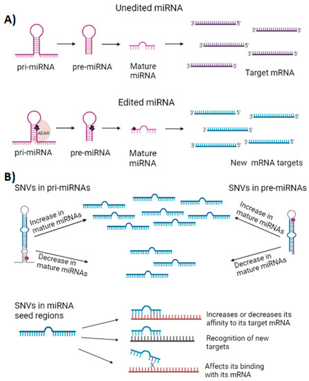 miRNAs can also be regulated by nucleotide modifications mediated by the RNA-acting adenosine deaminase (ADAR) family of proteins, which edit adenosines to inosines (A to I) in miRNA precursors, disrupting miRNA–target mRNA binding and redirecting them to a different target, as shown in Figure 1A. In addition, the cytidine deaminase/apolipoprotein B-induced activation protein family of cytidine deaminase mRNA editing enzymes (AID/APOBEC) can convert cytidine to uridine (C to U), thus generating cytidine variants. These miRNAs, called “isomiRs”, can regulate the same or different target mRNAs [28,29]. Another mechanism that can regulate miRNA expression is the presence of single-nucleotide variants (SNVs), which affects the secondary structure of the miRNA, as well as the maturation process and their functions [30]. SNVs within the miRNA seed region sequence can lead to the gain or loss of interactions with their target mRNA, while SNVs in the 3′-UTR of mRNA can likewise affect miRNA–mRNA binding, as shown in Figure 1B [31].