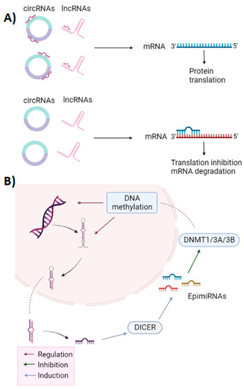 Other mechanisms of miRNA regulation. (A) epi-miRNAs are involved in the regulation of epigenetic factors associated with DNA methylation, such as DNMT1, DNMT3A, DNMT3B, which participate in the regulation of expression of some miRNAs that, through DICER, regulate epi-miRNAs, giving rise to a regulatory loop that is frequently altered in cancer. (B) Competing endogenous RNAs (ceRNAs), such as some long non-coding RNAs (lncRNAs) and circular RNAs (circRNAs), affect the interactions of miRNAs with their target mRNA, competitively sequestering miRNAs, reducing the repression of target mRNAs. Created with Biorender.com.