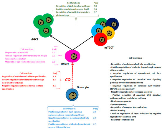 Functional analysis of the genes regulated by the miRNAs described in gonocytes, CO, GCNIS, and TGCT. The image shows a summary of the three main biological processes regulated by these miRNAs in gonocytes (blue), CO (red), GCNIS (pink), and TGCT (green), generated by GeneCodis 4 tool [111]. Finally, in black is shown the biological processes in common between the four stages regulated by these miRNAs.