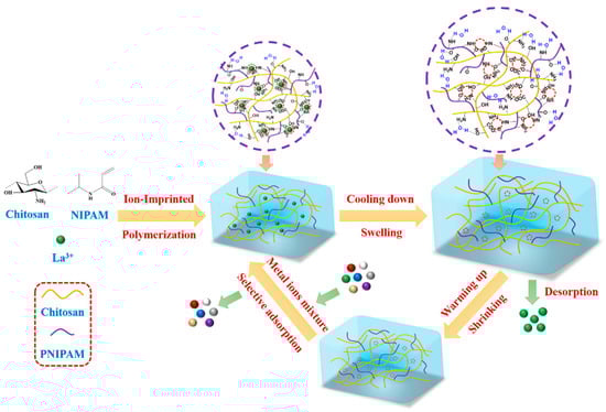 To overcome the shortcoming of using acid to regenerate the ion-imprinted materials, a novel water-recyclable chitosan-based La3+-imprinted thermoresponsive hydrogel (CLIT) was presented in the current work. Here, chitosan was used as the matrix because chitosan is the second abundant polysaccharide having many unique features, such as being biodegradable, highly hydrophilic, easy to be modified, and having a good ability to adsorb metal ions, etc. [] CLIT was prepared through a gradient heating ion-imprinting polymerization method (GHIP) proposed by our group, with La3+ as the template ion, chitosan as the matrix, and NIPAM as the thermosensitive monomer. CLIT can be easily regenerated by washing with cold water (about 10 °C), avoiding the adverse effects that the use of acids may have on the environment. The structure of CLIT was characterized by DSC, FTIR, Raman spectroscopy, SEM, and XPS. The adsorption capacity and adsorption selectivity with interfering ions (Y3+, Gd3+, Al3+, Fe3+ and Cu2+) were investigated. The adsorption kinetics was simulated with a quasi-first-order kinetic equation and quasi-second-order kinetic equation, and the adsorption isotherms were simulated with the Freundlich isotherm model and Langmuir isotherm model. Moreover, the desorption performance and the reusability were studied to understand the practical application potential of CLIT. The preparation, adsorption and desorption process of CLIT was schematically illustrated in Figure 1.