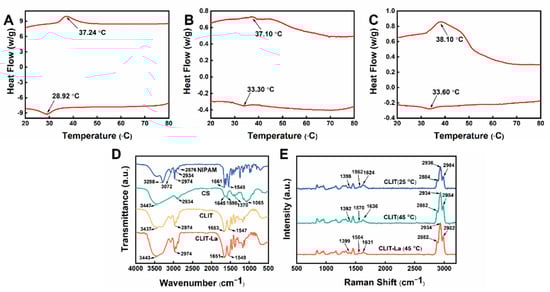 DSC curves of CLIT during repeated tests (the first test (A), second test (B), and third test (C)); FTIR spectra of CS, NIPAM, CLIT, CLIT-La (D); Raman spectra of hydrogels CLIT (25 °C), CLIT (45 °C), CLIT-La (45 °C) (E).