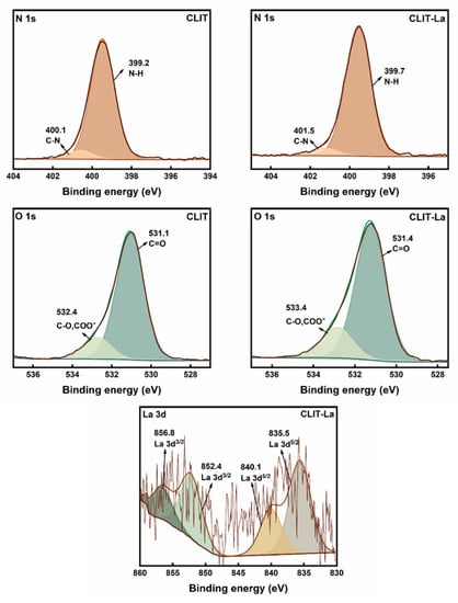 The XPS measurement was also used to measure the structure of CLIT and CLIT-La. The N 1s, O 1s and La 3d spectra of CLIT and CLIT-La are shown in Figure 3. In addition, we give the binding energy of CLIT and CLIT-La in Table 1. After the adsorption of La3+ ions, the N1s peak of N-H and C-N bonds showed a shift from 399.2 eV to 399.7 eV and 400.1 eV to 401.5 eV []. CLIT-La expressed a higher binding energy than CLIT, which indicated that the amino and imine group in CLIT was involved in the adsorption of La3+ []. In the O 1s plot of CLIT, the peaks at 531.1 eV and 532.4 eV were corresponding to C=O and C-O (COO−), respectively. After adsorbing La3+, the C=O peak shifted from 531.1 eV to 531.4 eV, and the C-O (COO−) peak changed from 532.4 eV to 533.4 eV []. The results suggested that the C=O, C-O and COO− were also related to the bonding between CLIT and La3+. Moreover, there were the La 3d5/2 characteristic peaks at 840.1 eV and 835.5 eV, and La 3d3/2 characteristic peaks at 856.8 eV and 852.4 eV, confirming that La3+ ions were successfully combined with CLIT [].
