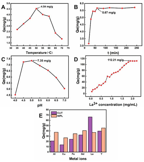 The effects of temperature (A), adsorption time (B), the pH value of the adsorption solution (C), the initial La3+ concentration (D) on the adsorption capacity of CLIT; (E) The adsorption capacity of CLIT and NIPL to metal ions coexisting in the same solution (containing Al3+, Cu2+, Fe3+, Gd3+, La3+ and Y3+).