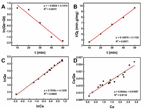 Adsorption simulation of CLIT with (A) quasi-first-order-kinetics; (B) quasi-second-order-kinetics; (C) Freundlich isotherm model; (D) Langmuir isotherm model.