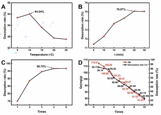 Furthermore, the desorption time was varied in the range of 5–30 min, with one desorption at 10 °C. As shown in Figure 7B, the desorption rate of La3+ increased with the increase of desorption time. When the desorption time was 25 min, the desorption rate of CLIT tended to equilibrate at around 75.07%. In addition, the desorption rate had no significant change, while the desorption continued. At a too short time, the hydrogel did not swell sufficiently, thus resulting in insufficient removal of La3+ ions. Once the hydrogel had swollen sufficiently at a longer time, the structure of the gel would not change further, and resulted in the desorption equilibrium.