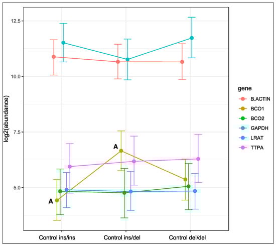 Relative BCO1, BCO2, LRAT, and TTPA mRNA levels in the liver of rabbits with different genotypes at codon 248 of the BCO2 gene (ins/ins vs. ins/del vs. del/del) fed the control diet. GAPDH and β-actin were used as reference genes. Data represent posterior means (expressed as arbitrary units) ± 95% credible intervals. Means followed by the same superscripts (A, A) differ highly significantly (p ≤ 0.01).