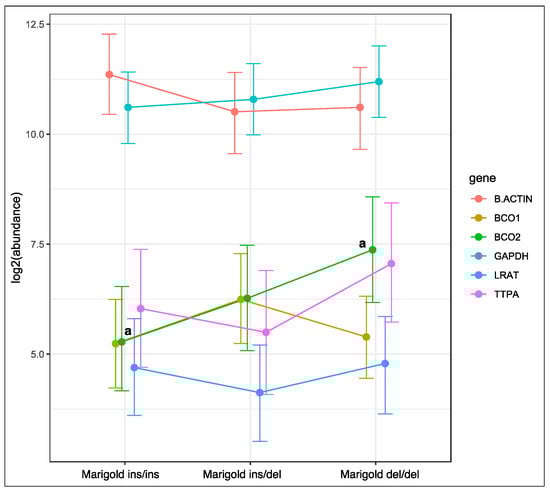 Relative BCO1, BCO2, LRAT, and TTPA mRNA levels in the liver of rabbits with different genotypes at codon 248 of the BCO2 gene (ins/ins vs. ins/del vs. del/del) fed a diet with the addition of Aztec marigold flower extract. GAPDH and β-actin were used as reference genes. Data represent posterior means (expressed as arbitrary units) ± 95% credible intervals. Means followed by the same superscripts (a, a) differ significantly (p ≤ 0.05).