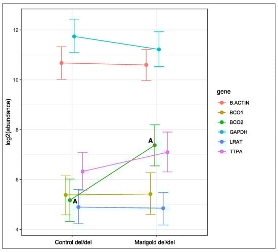 Relative BCO1, BCO2, LRAT, and TTPA mRNA levels in the liver of rabbits with the del/del genotype at codon 248 of the BCO2 gene, fed different diets (control diet vs. a diet with the addition of Aztec marigold flower extract). GAPDH and β-actin were used as reference genes. Data represent posterior means (expressed as arbitrary units) ± 95% credible intervals. Means followed by the same superscripts (A, A) differ highly significantly (p ≤ 0.01).