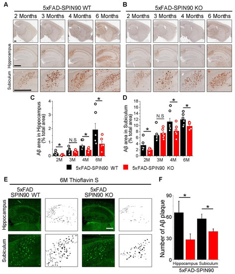 SPIN90 knockout reduces amyloid β (Aβ) deposition in AD model mice. (A,B) Representative images of Aβ plaques in the brains of 5xFAD-SPIN90 WT (A) and 5xFAD-SPIN90 KO mice (B), as shown by Dab reaction (brown) and hematoxylin straining (blue). Brains of mice aged 2, 3, 4, and 6 months were fixed and stained with anti-Aβ antibody. (Top) The entire area of a hemisphere; (middle) magnified images of the hippocampus; (bottom) magnified images of the subiculum. Scale bars, 500 μm. (C,D) Mean areas of Aβ deposition in the hippocampus (C) and subiculum (D) of brains from 2-, 3-, 4-, and 6-month old 5xFAD-SPIN90 WT (Black) and 5xFAD-SPIN90 KO (Red) mice. Total areas of Aβ plaque were quantified and normalized relative to areas of the hippocampus or subiculum. Hippocampus: [2M; Aβ plaque]5xFAD-SPIN90WT = 0.18 ± 0.05%, n = 18 (6 mice), [2M; Aβ plaque]5xFAD-SPIN90KO = 0.08 ± 0.01%, n = 18 (6 mice), [3M; Aβ plaque]5xFAD-SPIN90WT = 0.4 ± 0.07%, n = 21 (7 mice), [3M; Aβ plaque]5xFAD-SPIN90KO = 0.36 ± 0.03%, n = 21 (7 mice), [4M; Aβ plaque]5xFAD-SPIN90WT = 0.75 ± 0.1%, n = 21 (7 mice), [4M; Aβ plaque]5xFAD-SPIN90KO = 0.44 ± 0.04%, n = 21 (7 mice), [6M; Aβ plaque]5xFAD-SPIN90WT = 1.9 ± 0.47%, n = 18 (6 mice), [6M; Aβ plaque]5xFAD-SPIN90KO = 0.89 ± 0.17, n = 18 (6 mice). Subiculum: [2M; Aβ plaque]5xFAD-SPIN90WT = 3.58 ± 0.66, n = 18 (6 mice), [2M; Aβ plaque]5xFAD-SPIN90KO = 2.04 ± 0.2, n = 18 (6 mice), [3M; Aβ plaque]5xFAD-SPIN90WT = 6.79 ± 0.7, n = 21 (7 mice), [3M; Aβ plaque]5xFAD-SPIN90KO = 7.54 ± 0.5, n = 21 (7 mice), [4M; Aβ plaque]5xFAD-SPIN90WT = 11.29 ± 1.09, n = 21 (7 mice), [4M; Aβ plaque]5xFAD-SPIN90KO = 8.22 ± 0.67, n = 21 (7 mice), [6M; Aβ plaque]5xFAD-SPIN90WT = 12.02 ± 0.73, n = 18 (6 mice), [6M; Aβ plaque]5xFAD-SPIN90KO = 9.85 ± 0.43, n = 18 (6 mice). (E) Representative images of thioflavin S- stained Aβ plaques in the hippocampus and subiculum in the brains of 6-month-old 5xFAD-SPIN90 WT (left) and 5xFAD-SPIN90 KO (right) mice. Images are shown inverted to clearly display Aβ plaques. Scale bars, 500 μm. (F) Quantification of Aβ aggregates in the hippocampus and subiculum of 5xFAD-SPIN90 WT and 5xFAD-SPIN90 KO mice. [Hippocampus: Aβ aggregates]5xFAD-SPIN90WT = 65.83 ± 15.88 (n = 6), [Hippocampus: Aβ aggregates]5xFAD-SPIN90KO = 28.17 ± 7.94 (n = 6), [Subiculum: Aβ aggregates]5xFAD-SPIN90WT = 57.33 ± 6.32 (n = 6), [Subiculum: Aβ aggregates]5xFAD-SPIN90KO = 39.5 ± 3.61 (n = 6). * p < 0.05. N.S.; not significant.