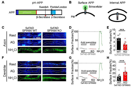 Findings showing that the deletion of SPIN90 reduced Aβ production and that SPIN90 is involved in membrane trafficking [21,22,23,24] suggested that SPIN90 may be involved in APP trafficking. To test this hypothesis, APP distribution was evaluated on the membranes of various areas of neurons, including axons, dendrites, and soma. pHluorin has a pKa of 7.1, making it useful for evaluating surface and internal vesicle trafficking [28,29]. Surface and internal APP were therefore traced using a recombinant APP with pHluorin at its N-terminus (pH-APP) (Figure 2A). APP on membrane surfaces and internals could be quantified by sequentially applying acid quenching solution (AQ) (e.g., MES, pH5.5) and alkalizing solution (e.g., NH4Cl, pH7.4) [30]. Under resting conditions, the surface fraction of APP differed in various areas of 5xFAD-SPIN90 WT neurons, with higher accumulation in dendrites and soma (about 10–12%) than in axons (about 5.85%) (Figure 2B–H, Figure S5A–C). APP distribution differed, however, in the 5xFAD-SPIN90 KO neurons, with higher APP surface fraction in dendrites (~23.3%) and lower accumulation in axons (~2.7%) (Figure 2B–H). These findings indicate that the surface distribution of APP is both locally distinct and regulated by SPIN90.
