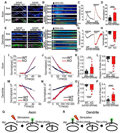 Activity-driven recycling of APP in axons and dendrites is enhanced in 5xFAD-SPIN90 KO neurons. (A,E) Representative images of pH-APP in axons (A) and dendrites (E) of 5xFAD-SPIN90 WT (left) and 5xFAD-SPIN90 KO (right) neurons at rest (top), in the presence of an action potential (AP) of 600 (middle), and after NH4Cl treatment (bottom). Scale bar: 5 μm. (B,F) Kymographs of pH-APP in corresponding areas of axons (B) and dendrites (F) in 5xFAD-SPIN90 WT (top) and 5xFAD-SPIN90 KO (bottom) neurons in response to 600AP. (C,G) Representative traces of pH-APP in axons (C) and dendrites (G) of 5xFAD-SPIN90 WT (black) and 5xFAD-SPIN90 KO (red) neurons in response to 600AP. (D,H) Mean peak amplitudes in axons (D) and dendrites (H) of 5xFAD-SPIN90 WT and 5xFAD-SPIN90 KO neurons in response to 600AP. [600AP: axon]5xFAD-SPIN90WT = 9.30 ± 1.31% (n = 8 cells), [600AP: axon]5xFAD-SPIN90KO = 25.87 ± 3.69% (n = 8 cells); [600AP: dendrite]5xFAD-SPIN90WT = −5.48 ± 0.62% (n = 10 cells), [600AP: dendrite]5xFAD-SPIN90KO = −20.80 ± 2.05% (n = 13 cells). Representative traces of pH-APP with linear fit-line during stimulation of (I) axons and (M) dendrites and after stimulation of (J) axons and (N) dendrites in 5xFAD-SPIN90 WT (black) and 5xFAD-SPIN90 KO (red) neurons. (K,O) Mean slopes as determined by linear fitting during stimulation of axons (K) and dendrites (O) in 5xFAD-SPIN90 WT and 5xFAD-SPIN90 KO neurons. [Degree of slope: axon]5xFAD-SPIN90WT = 0.33 ± 0.05 (n = 10 cells); [Degree of slope: axon]5xFAD-SPIN90KO = 0.97 ± 0.15 (n = 14 cells); [Degree of slope: dendrite]5xFAD-SPIN90WT = −0.17 ± 0.05 (n = 11 cells); [Degree of slope: dendrite]5xFAD-SPIN90KO = −0.65 ± 0.11 (n = 13 cells). (L,P) Mean slopes as determined by linear fitting after stimulation of axons (L) and dendrites (P) in 5xFAD-SPIN90 WT and 5xFAD-SPIN90 KO neurons. [Degree of slope: axon]5xFAD-SPIN90WT = −0.057 ± 0.01 (n = 10 cells); [Degree of slope: axon]5xFAD-SPIN90KO = −0.18 ± 0.03 (n = 14 cells); [Degree of slope: dendrite]5xFAD-SPIN90WT = 0.032 ± 0.009 (n = 11 cells); [Degree of slope: dendrite]5xFAD-SPIN90KO = 0.16 ± 0.03 (n = 13 cells). (Q) Schematic illustration of activity-driven pH-APP recycling in axons (endosome-surface-endosome). (R) Schematic illustration of activity-driven pH-APP recycling in dendrites (surface-endosome-surface). ** p < 0.01, *** p < 0.001.