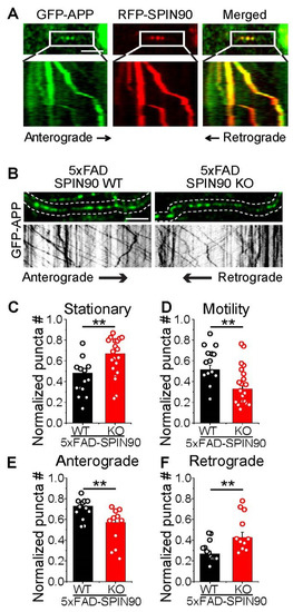 APP processing and trafficking can be further classified not only by local recycling between surfaces and internals but also by the motility of APP via axons and dendrites. To determine whether SPIN90 is involved in APP motility and trafficking via axons, neurons cotransfected with GFP-APP and RFP-SPIN90 were monitored by live-cell imaging. This monitoring showed that some GFP-APP and RFP-SPIN90 molecules colocalize and remain stationary whereas other GFP-APP and RFP-SPIN90 molecules move together through axons (Figure 4A). Analysis of APP motility in 5xFAD-SPIN90 WT and 5xFAD-SPIN90 KO neurons showed that APP motility through axons was lower in 5xFAD-SPIN90 KO than in 5xFAD-SPIN90 WT neurons, with anterograde movement also reduced in 5xFAD-SPIN90 KO neurons (Figure 4B–F), indicating that SPIN90 is involved in APP motility through axons.