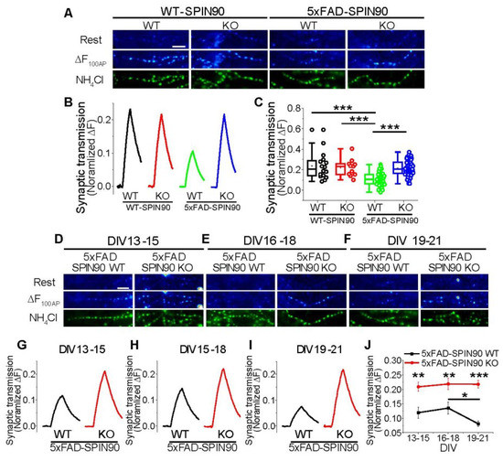 Although AD usually results in neurodegeneration or neuronal cell death, Aβ has been shown to cause synaptic depression and synaptopathy [32,33,34,35,36] prior to neuronal cell death. Because SPIN90 ablation reduced Aβ accumulation, the ability of SPIN90 deficiency to restore activity-driven synaptic function, such as synaptic transmission, was investigated. The combination of a primary hippocampal culture system and a pHluorin-based assay has been utilized to monitor activity-driven synaptic transmission [37,38]. The fusion of the pH-sensitive GFP protein pHluorin to the luminal region of the synaptic vesicle protein, vesicular glutamate transporter1 (vGlut1), yields the protein vGlut-pHluorin (vG-pH), a very efficient sensor of synaptic function (e.g., synaptic transmission) [28,30]. The protein vG-pH was introduced into primary hippocampal neurons from WT-SPIN90 WT, WT-SPIN90 KO, 5xFAD-SPIN90 WT, and 5xFAD-SPIN90 KO mice, and synaptic transmission in response to stimulation with 10 Hz for 10 s (100 APs) was monitored. Synaptic transmission was ~50% lower in 5xFAD-SPIN90 WT than in WT-SPIN90 WT neurons (Figure 7A–C), in good agreement with previous results [34]. However, synaptic transmission in 5xFAD-SPIN90 KO neurons recovered almost completely, similar to that in controls (Figure 7A–C). These findings suggested that the reduced level of Aβ plaque accumulation in 5xFAD-SPIN90 KO neurons has an effect on synaptic functionality.